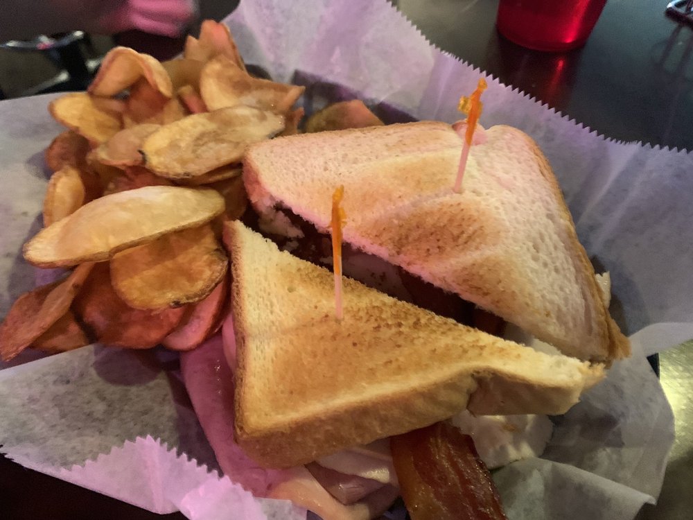 Ham, turkey, bacon, cheese, lettuce, and tomato on Texas toast and seriously piled high. Add bacon, fried egg for an additional charge.